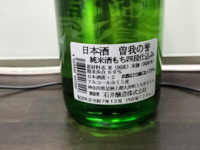 料理との相性も良く、煮物や焼き魚、味噌を使った料理など、しっかりとした味付けの和食と特によく合う。酒の濃醇な旨味が料理の味わいと重なり合いながらも、後味のキレが口中を整え、食事全体を引き立てる役割を果たす。総じて「曽我の譽 純米酒もち四段仕込み」は、伝統技法が生み出す力強い旨味と奥行きを備えた一本であり、日常の中でじっくり楽しみたい実直な純米酒である。